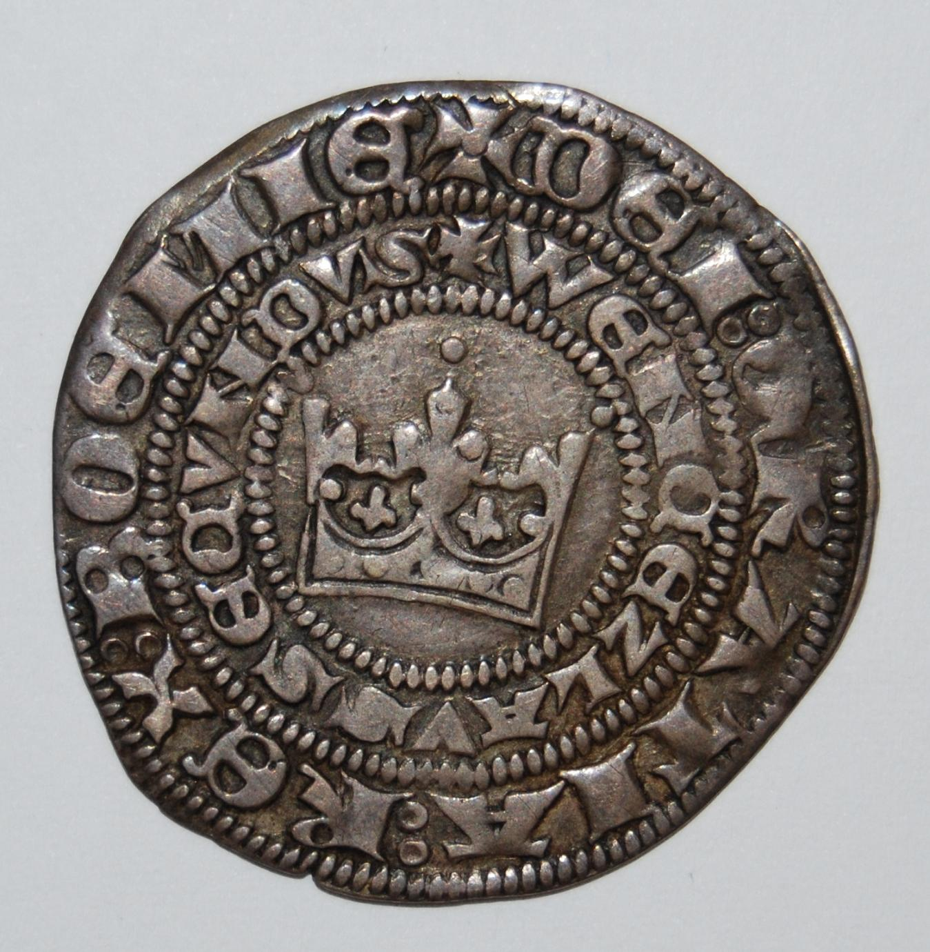 Stary medal z wizerunkiem króla w koronie. Król ukazany z profilu, długie kręcone włosy opadają mu na ramiona. Na brzegu monety napis po łacinie.