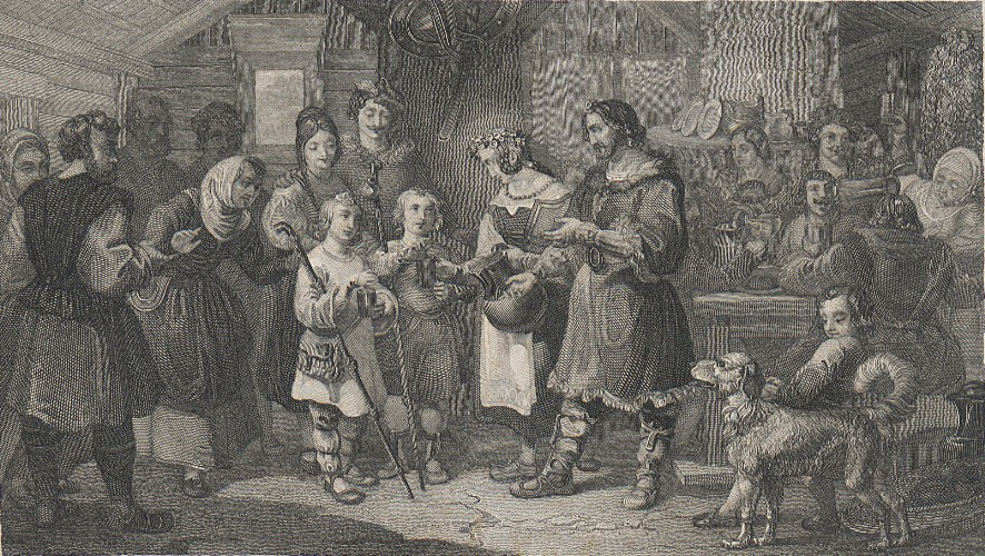 Stara rycina. Przedstawia scenę w kościele. Pośrodku na klęczniku para kobieta i mężczyzna. Klęczą przed biskupem, który udziela im ślubu. Z prawej strony ołtarz, świece. Z lewej strony zebrani świadkowie. Pod grafiką napis: Zaślubienie Marii Klementyny Sobieskiej z Jakubem III, królem angielskim.