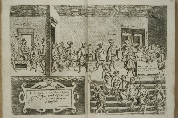 Kolejnym źródłem, które w tej kwestii może dostarczyć istotnych informacji, jest ilustrowana księga Jana Amosa Komenského Orbis sensualium pictus, wydana w 1658 roku jako elementarz dla dzieci. Szczególnie ważnym zdaje się być tutaj obrazek zatytułowany Bankiet, na którym odnajdujemy krajczego, cześnika, dbającego o piwnicę, sługę przynoszącego wodę do obmycia rąk przed jedzeniem oraz kredencerzy, odpowiedzialnych za opiekę nad zawartością kredensu. Z kolei na ilustrowanym przedstawieniu kuchni widzimy ponadto postać szafarza, którego zadanie stanowiło zarządzanie zasobami spiżarni. Warto w tym względzie dodać, iż bardzo szczegółowe przedstawienia graficzne wnętrz kuchni znajdują się również w czeskich książkach kucharskich, chociażby w Kuchařství Pavla Severýna, wydanej w 1535 r. w Pradze.