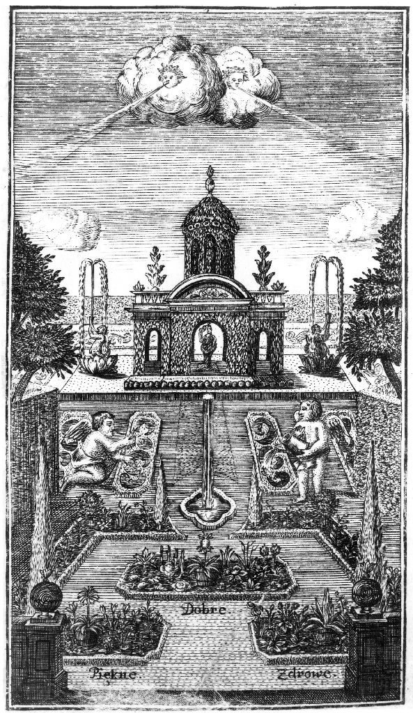 Grafika przedstawia widok na fontannę w stylu barkowym, bogato zdobioną. W tle ogród i spacerujący ludzie.
