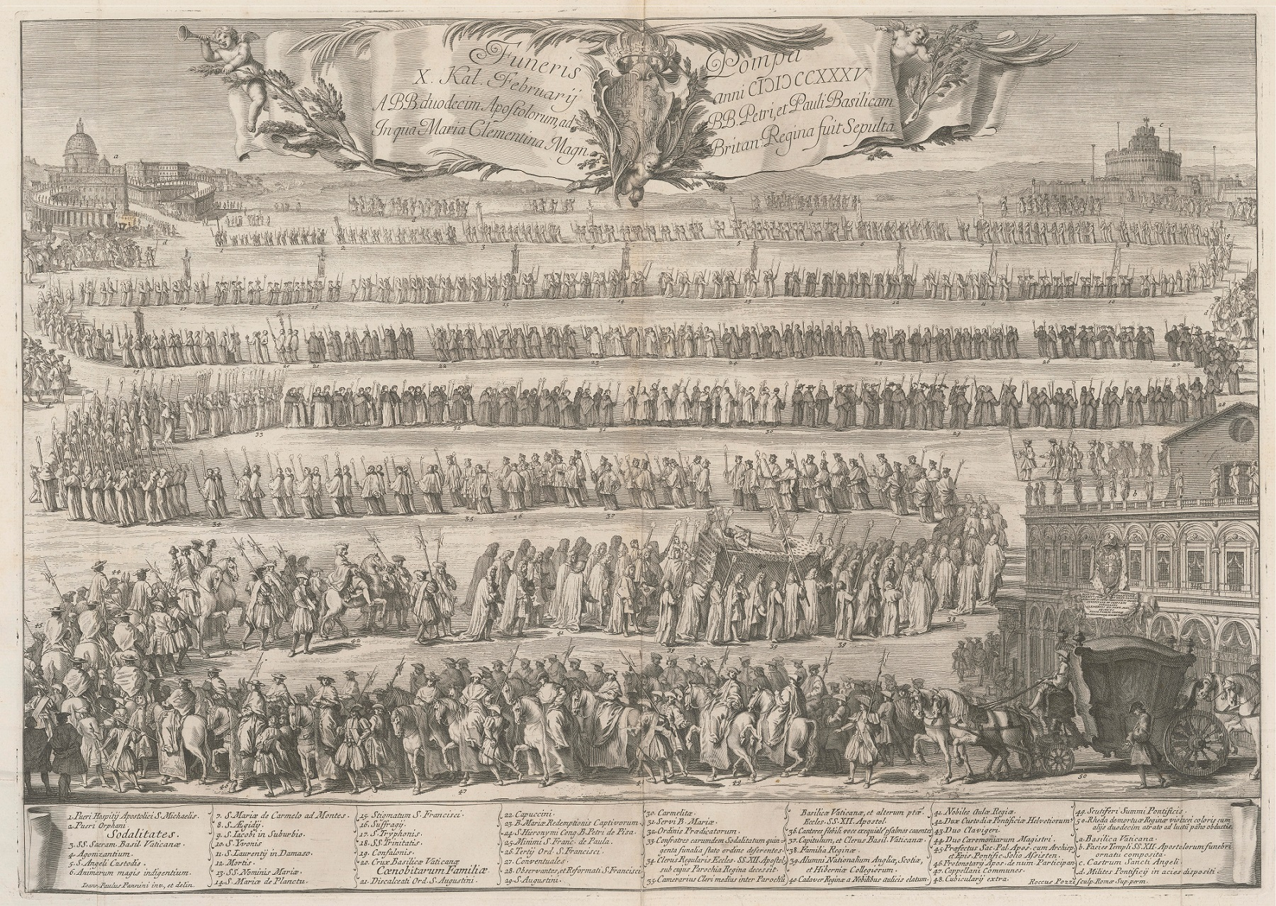 Uwiecznił go w akwaforcie rzymski rytownik Rocco Pozzi (zm. ok. 1780), na podstawie rysunku ad vivum (?) Giovanniego – Paola Panniniego (1691 lub 1692–1765). Kondukt kieruje się z kościoła Najświętszych Apostołów do widocznej na horyzoncie bazyliki św. Piotra. Ujęty z góry, ale nie z lotu ptaka, został oznaczony w obrębie kompozycji liczbami od 1 do 50, odnoszącymi się do poszczególnych grup, z towarzyszącą u dołu legendą. Orszak, zakręcający serpentynami sześciokrotnie, tworzy w sumie siedem równoległych odcinków, usytuowanych na coraz odleglejszych planach. Jego czoło zbliża się do placu św. Piotra, znaczone malutkimi sylwetkami uczestników; smutną kawalkadę zamyka pierwszoplanowa karoca, obita kirem, odjeżdżająca właśnie spod fasady kościoła SS. Apostoli. Na drugim planie alumni narodowych kolegiów angielskich, szkockich i irlandzkich, trzymając płonące pochodnie, otaczają wysokie mary z ciałem królowej, ubranym w monarsze (a nie zakonne) szaty. W górze kompozycji unosi się lekko sfalowana, szeroka wstęga z napisem, rozdzielonym rokokowym kartuszem zwieńczonym koroną, w którym widnieje 5 pól z herbami Polski. W całość wplecione są trzy putta, buszujące wśród gałęzi laurowych.