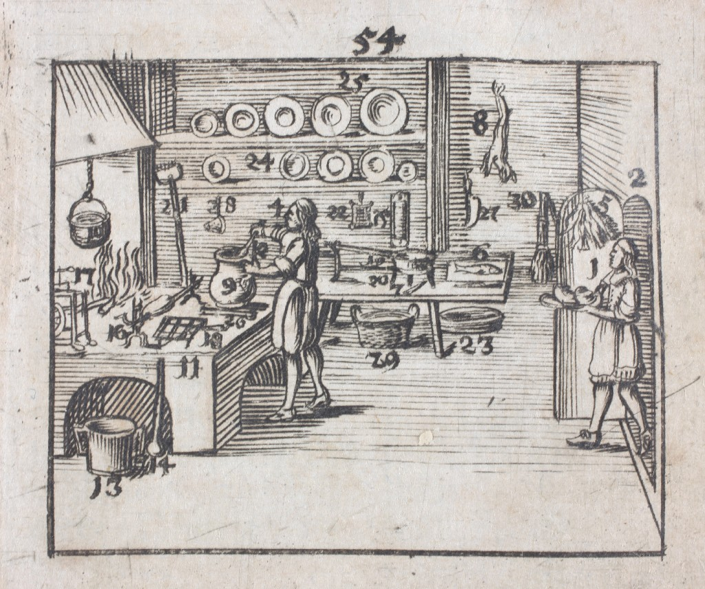 Fragment obrazu przedstawiający leżące na blacie ryby, i kota. Powyżej zwisająca głowa zabitej gęsi i nóż. Jest to fragment obrazu olejnego Jakoba Mathama „Wnętrze kuchni”.