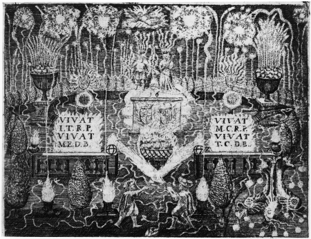 Pamiątką tych uroczystości jest druk Andrzeja Rudolfa Margowskiego pt. Porta triumphalis, augusto destinata ingressui Dum Serenissimo Principi Maximiliano II (...) & Serenissima Princeps Teressia Cunegunda, wydany w 1694 r. ,Typis Academiae Posnaniensis w Poznaniu, ilustrowany jedyną ryciną, przedstawiającą fajerwerki. Ów niewielki i niesygnowany miedzioryt jest zapewne wytworem jakiegoś sztycharza poznańskiego, nie najwyższego lotu. Trzeba jednak podkreślić, że sztuczne ognie jest niezmiernie trudno oddać w grafice, zwłaszcza przy pomocy rylca, ponieważ z samego swego założenia kompozycja taka musi rozgrywać się w nocy. Dotkliwym mankamentem jest brak kolorów, tu zastąpionych jasnymi smugami i plamami świateł, wyłaniającymi się z czerni. W efekcie powstała dekoracyjna, lecz płaska scena, w której znajdujemy wazy ze sztucznymi owocami, posągi Jupitera i Junony, grupę trzech delfinów, tarcze z inskrypcjami, globusy – a z wszystkich tych elementów wysoko tryskają race. Na pierwszym zaś planie dwaj kawalerowie toczą ognistymi mieczami pojedynek, jakby żywcem wyjęty z popularnych w XX wieku Gwiezdnych Wojen.