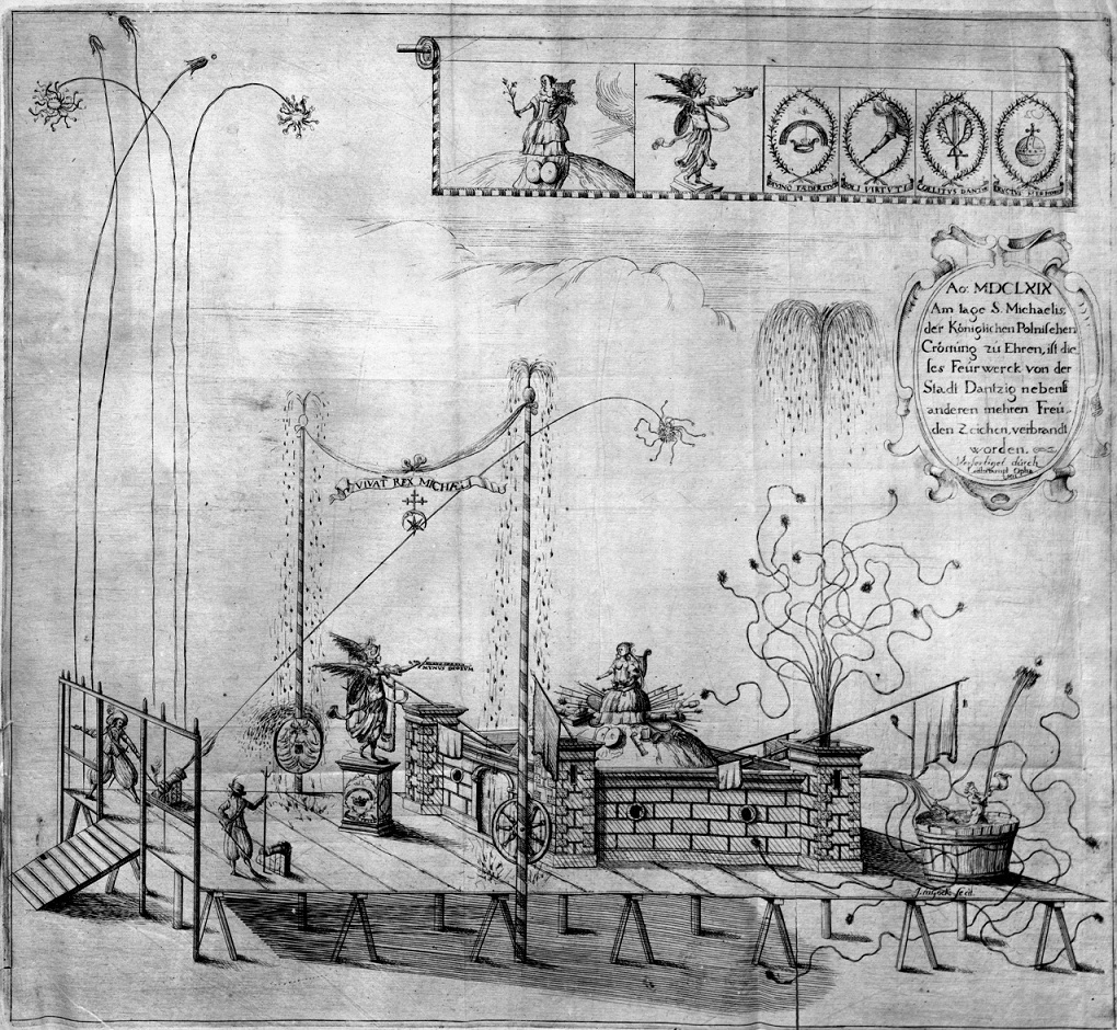 Z okazji koronacji Henryka Walezego (1574) na wzgórzu wawelskim skonstruowano figurę rycerza na koniu (Pogoń) emitującego ogień. Jezuici warszawscy w ramach oprawy zaślubin króla z Cecylią Renatą (1637) „rozmaitemi lampami, ogniami, obrotami słonecznemi, miesięcznemi, wieżę swoją przykryli i otoczyli”, zaś podskarbi koronny ze specjalnie uformowanej wieży „foremne i odważne ognie i race puszczać kazał”. “Ognie artificjalne” wybuchały także na cześć koronowanego 29 września 1669 r. Michała Korybuta Wiśniowieckiego. Niestety, obciążające kasę stołeczną 300 florenami, przygotowane przez panów Rabela i Przybysławszczyka fajerwerki na rynku krakowskim nie wypaliły, a konkretnie „trafunkowym na spod iskry zapadnieniem, w jedno płomienia chaos idąc, spodziewanego nie uczyniły afektu” (J. A. Janicki, Akt koronatiey…Michała, Kraków 1670). Więcej szczęścia lub wiedzy technicznej okazali się mieć puszkarze gdańscy. Zachowana w kilku egzemplarzach rycina Johanna Michaela Gockhellera (odbitka 35 x 32cm, Biblioteka Gdańska PAN, Nl 62 adl. 38 oraz Archiwum Państwowe w Gdańsku 300, R/Ff 51) przedstawia fajerwerki zaprezentowane w grodzie nad Motławą w dniu św. Michała przez porucznika Uphagena. Obok złożonych emblematów, głównym elementem kompozycji była figura tronującej na ufortyfikowanym wzniesieniu Lechii oraz Michała Archanioła –prefiguracja nowego władcy. Na jego mieczu dostrzegamy napis: MUNUS DEORUM – „dar bogów”.