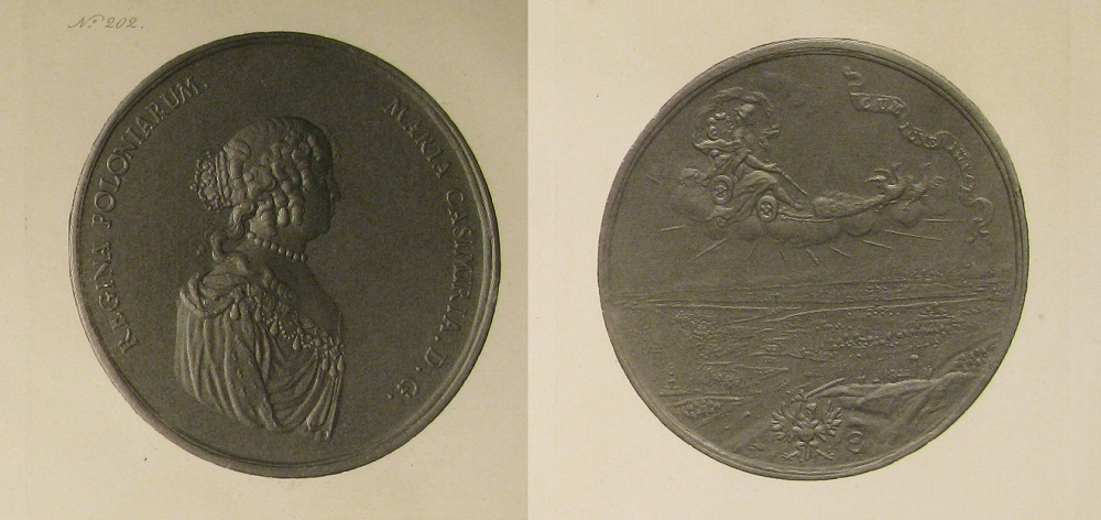 Podsumowując, należy zauważyć, że przyjęty sposób wyróżnienia Marii Kazimiery, nawiązujący bezpośrednio do wzorców rzymskich, polegający na uwiecznieniu postaci podczas jazdy rydwanem w realiach fantastycznych lub historycznych, znalazł kontynuację w programie okolicznościowych grafik i płaskorzeźb wykonywanych zwłaszcza po największym osiągnięciu militarnym króla ‒ zwycięskiej odsieczy wiedeńskiej. Wymienić w tym miejscu można chociażby kompozycję sztukatorską ukazującą triumf polskiego monarchy: uroczysty przejazd Jana III Sobieskiego na rydwanie, wykonaną pomiędzy 1686 a 1694 rokiem, zlokalizowaną zaś na elewacji frontowej skrzydła południowego pałacu wilanowskiego. Opisywany żeton i medal stanowiły więc jedynie element kampanii propagandowej zakrojonej na znacznie większą skalę i realizowanej przez następne lata rządów królewskich, której podstawowym celem stało się upamiętnienie reprezentantów rodu Sobieskich na równi z innym członkami europejskiej elity. Prócz przytoczonych przykładów istnieje szereg grafik i portretów malarskich, a także liczne monety i medale, na których widnieje podobizna Jana III Sobieskiego w kostiumie antycznym: paludamencie, zbroi karacenowej z kwadratowym wycięciem wokół szyi i wieńcem laurowym na głowie. Do podobnych idei zaczerpniętych ze świata antyku nawiązywali także inni władcy, posiadający znacznie szersze prerogatywy polityczne m.in. Leopold I Habsburg.