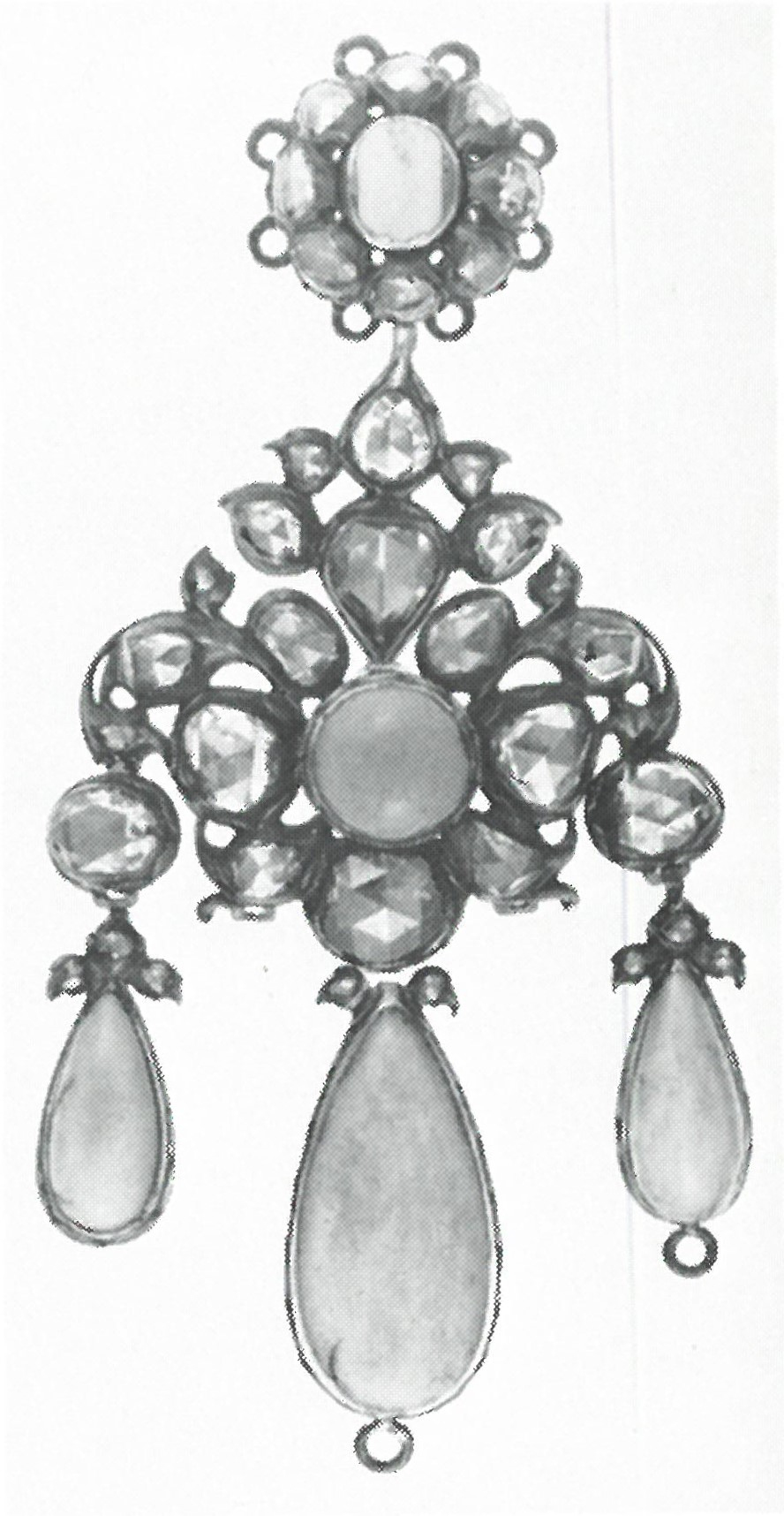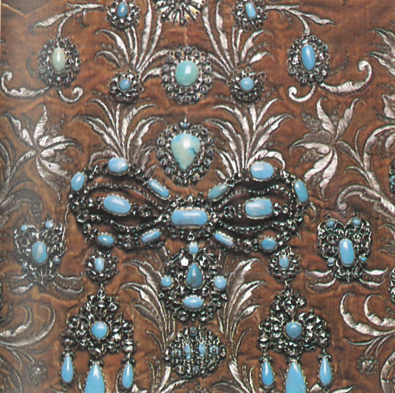 Do dziś zachował się kompletny garnitur tej biżuterii liczący 59 sztuk wykonanych ze złota i srebra, zdobionych emalią i kamieniami (do ozdoby użyto 1300 fasetowanych diamentów i 243 turkusy). Jest to z pewnością dekoracja przodu paradnej sukni.