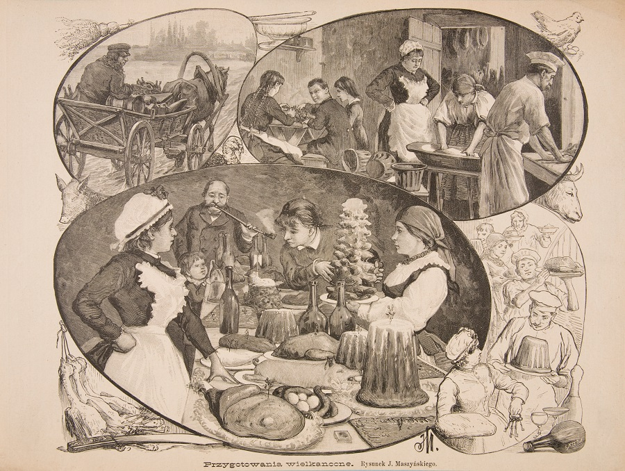 W niegdysiejszych obchodach Wielkanocy, jak można wnioskować z zamieszczanych w „Gazecie Warszawskiej” felietonów Gerarda Maurycego Witowskiego z lat 1816–1821, najważniejsze miejsce zajmowało święcone, czyli eleganckie i obfite śniadanie. Intensywne i staranne przygotowania zaczynały się znacznie wcześniej, ponieważ przed zaproszonymi z tej okazji gośćmi należało wystąpić w sposób jak najbardziej okazały i wytworny. Witowski – publicysta, poeta i tłumacz, autor cyklu felietonów pod nazwą Pustelnik z Krakowskiego Przedmieścia, czyli charaktery ludzi i obyczajów – narzekał, że zupełnie nie sposób wymówić się od licznych zaproszeń ze strony znajomych i sąsiadów.