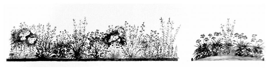 Według tego planu rabata miała 6 stóp, czyli ok. 1,95 m, szerokości i była obramowana niskim żywopłotem z bukszpanu. Kwiaty sadzono w rzędach, w trzech grupach:
