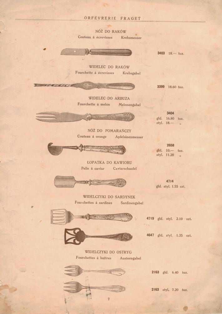 Gama asortymentu sztućców oferowana w katalogach z XIX w. jest imponująca. Można w tej grupie doliczyć się około stu przedmiotów. Ważną sprawą dla ówczesnego odbiorcy była możliwość stopniowego kompletowania wybranego zestawu. Pozwalało na to wieloletnie utrzymywanie w produkcji tych samych wzorów i dekoracji. Kolekcje takie początkowały komplety często ofiarowywane jako prezenty ślubne. W dzisiejszym asortymencie część sztućców jest w ogóle niespotykana i niepowtarzana, niekiedy zapomniano nawet, jak ich się używało. Do mniej znanych obecnie sztućców należą: czerpaczki do jaj, czerpaczki do soku, łyżki do lodów, łyżeczki do nakładania konfitur, łyżki do ponczu, lemoniady i kruszonu oraz łopatka do pasztetu. Z użycia wyszły także niektóre noże oraz przyrządy ostre: nóż do otwierania szampańskiego wina, sztylecik do orzechów, nóż do pomarańczy, nożyczki do winogron, szpikulec do mięsiwa, noże do jaj, nóż do lodów. Podobny los spotkał widelce: do arbuza i do pikli oraz takie utensylia jak uchwyt do pieczystego, uchwyt do talerzy, popychacz, kółko do serwety, podstawkę do menu, młotek do kruszenia lodu, praskę do cytryn.