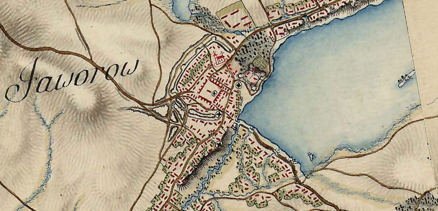 Jaworów. Widok miasta i dawnego królewskiego założenia dworskiego przy zachodnim brzegu Stawu Jaworowskiego. Fragment mapy F. von Miega, 1779–1783
