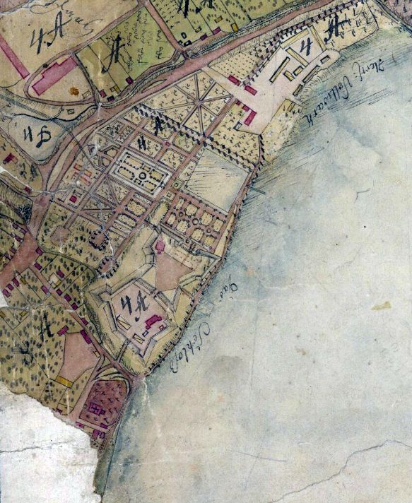 Fragment kolorowej mapy z 18 wieku. Jest to widok miasta Jaworów i dawnego królewskiego założenia dworskiego przy zachodnim brzegu Stawu Jaworowskiego.