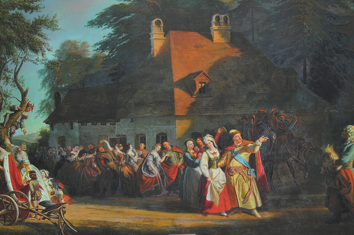 K. Szlegel, „Wesele w Jaworowie” (fragment z widokiem dworu od północnego-zachodu), ol. pł., przed 1868r., wielkoformatowa reprodukcja w Urzędzie Miasta w Lubaczowie (oryginał w zbiorach Muzeum Historycznego we Lwowie)