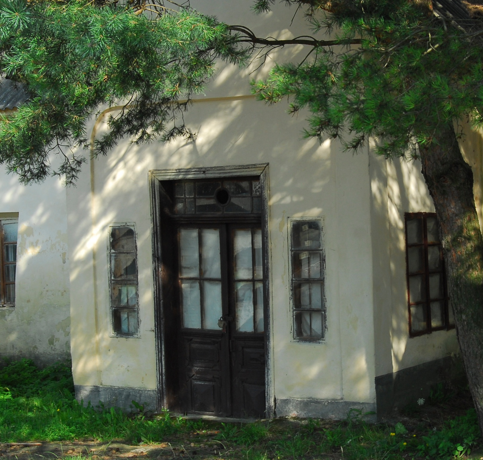 Kolorowe zdjęcie współczesne. Przedstawia ganek w dworku. Ciemno brązowe drzwi zamknięte są na kłódkę. Okna zasłonięte papierem. Jest to ganek dworu w Jaworowie, widok od południowego-zachodu.