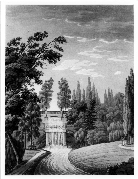 Prezentowana tu sepiowa akwatinta Wilhelma Friedricha Schlötterbecka (1777–1819), sporządzona według rysunku Williama Allena, przedstawia drugą – obok Wielkiego Wodospadu – kaskadę parku, określaną różnie: jako Świątynię Kanopa, Świątynię Egipską, Świątynię Wenery i Grotę Tetydy. Od czoła poprzedzały ją cztery monolitowe, pięciołokciowej wysokości granitowe kolumny, dźwigające również monolitowe, gładkie belkowanie, zwieńczone półkolistą arkadą ze szkła kolorowego. Całość nakrywał mostek z ażurową balustradą i drugą arkadą, przez którą woda z górnego stawu spływała po stopniach w dół, tworząc przed kolumnami ażurową zasłonę (czasem zwaną „fartuszkiem Zosi”). Opisana świątynia pełniła nie tylko dekoracyjną funkcję: poza kolumnadą mieściła także obszerną grotę, wymarzoną do odpoczynku w skwarne dni. Akwatinta Schlötterbecka pochodzi z cyklu sześciu nastrojowych rycin, ilustrujących francuski przekład słynnego dzieła Trembeckiego Sophiovka. Poème polonaise, par... Traduit en vers français par le Comte Lagarde..., wydany w Wiedniu w 1815 r. To luksusowe wydanie in folio, na czerpanym papierze, zawiera również (oprócz sztychowanych widoków parku) rytowane portrety autora i tłumacza oraz wstęp Jana Potockiego, zięcia Stanisława Szczęsnego.