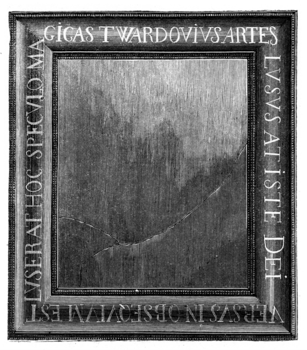 Wymieniony Przypkowski wysunął przypuszczenie, że zwierciadło zostało wykonane w Polsce, w XVI w., np. w rezydencji zaprzyjaźnionego z Twardowskim biskupa Franciszka Krasińskiego w Bodzentynie, lecz hipotezy tej nie potwierdzają żadne źródła historyczne. Według Romana Bugaja (1976) miejsca powstania zabytku należałoby szukać raczej w Niemczech, wiadomo bowiem, iż tamtejsi czarodzieje z kręgu Fausta posługiwali się magicznymi zwierciadłami, prawdopodobnie własnej produkcji. Jedno z takich unikatowych luster mógł nabyć Twardowski wraz z Krasińskim podczas wspólnych studiów w Wittenberdze. Pierwszą naukową informację o zwierciadle podał w 1828 r. historyk Teodor Narbutt, wzmiankując w niej już o pęknięciu metalowej tafli na trzy nierówne części: „(...) uczniowie dawniej ciskali w zwierciadło ciężkimi rzeczami dlatego, że w nim ukazywały im się postacie wykrzywiające się w przeraźliwy sposób. Na ostatek, jeden cisnąwszy kluczami kościelnymi, roztrzaskał zwierciadło tak, że już odtąd ukazywać masek dziwacznych zaprzestało”. Narbutt utrwalił więc – jako pierwszy – pogląd o cudownych właściwościach zabytku, nie wiedział tylko, z jakiego metalu go sporządzono. W 1871 r. kierownik artystyczny „Kłosów”, Marcin Olszyński, wykonał pierwszą fotografię zwierciadła, uprzednio czyszcząc je z plam i śniedzi. Orzekł, iż obiekt wykonano „z aliażu używanego powszechnie na zwierciadła, przed wynalezieniem szklanych (...). Główne części składowe stanowią bizmut i antymon z niewielką domieszką miedzi (...). Obraz daje zafarbowany lekko na czerwono, a w odległości 8 do 10 łokci już obraz staje się niewyraźny”.