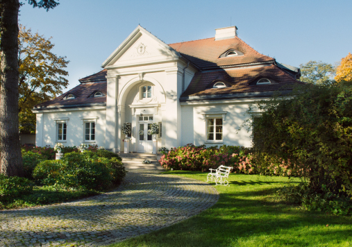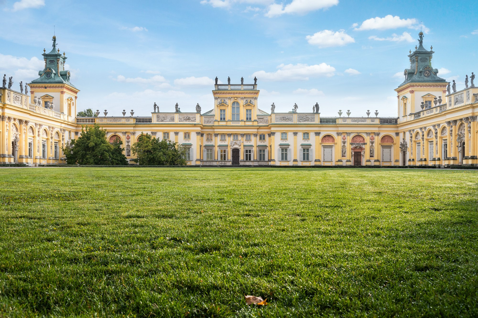 Територія перед двором палацу складається з чотирьох кварталів, обнесених цегляно-керамічною стіною та засаджених рядами дерев. Широка центральна алея є початком головної осі, що йде на захід, яка за правління короля Яна III перетворилася на 400-метровий водний канал, який розпливався перед навколишніми полями та Варшавським укосом. Наприкінці XVIII століття квартали були прорізані трипроменевою алейною системою, т. зв. гусяча лапка, яка використовувалася у французькому стилі дизайну. Протягом наступних двох століть квартали були доповнені декількома спорудами, які існують і донині: символічна усипальниця – мавзолей Потоцьких і господарський будинок доглядачів (нині каса музею), будинок Ланчі і дім Шеничувка (тепер вілла Інтрата). Внутрішньому двору палацу передує рів з цегляною підпірною стіною та барокова брама з кам’яними фігурами Марса та Венери, що символізують війну та перемогу.