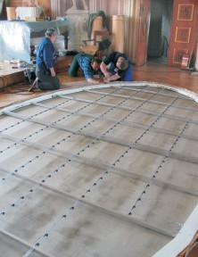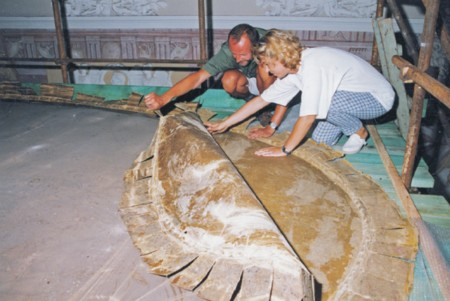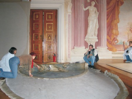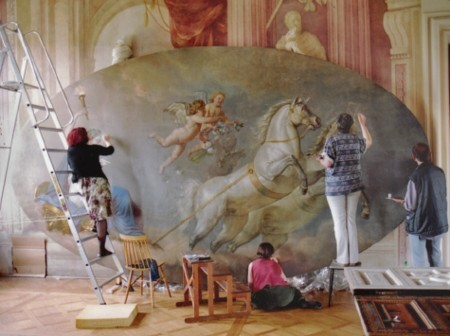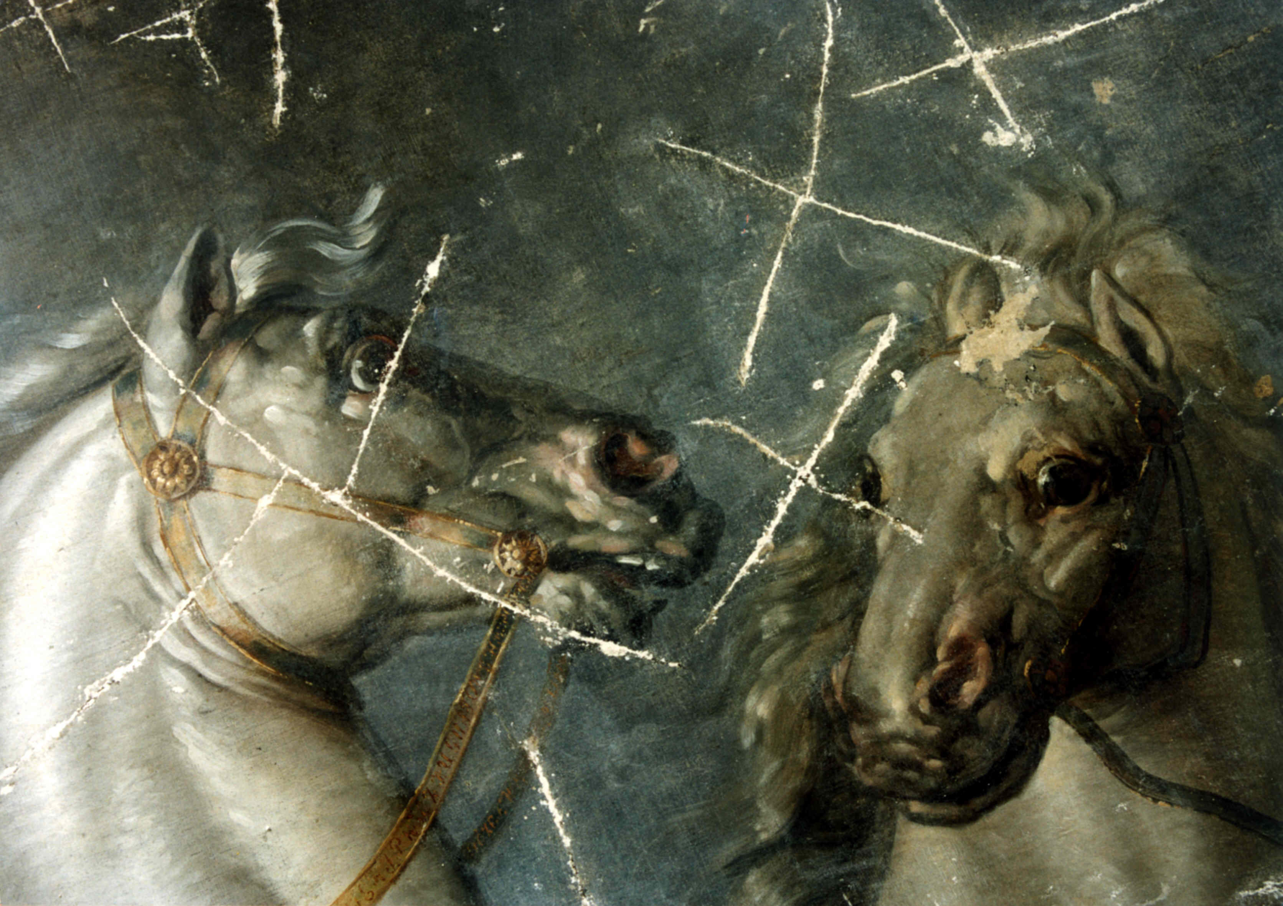 Sala z bogato zdobionymi ścianami, przedstawiającymi malowidła klasycznych postaci i kolumn. Pomieszczenie ma dekoracyjny sufit z rzeźbionymi sztukateriami oraz duże okna z ciężkimi złotymi zasłonami. Wnętrze jest umeblowane antycznymi meblami, a na środku ustawione są rzędy krzeseł. Grupa konserwatorów pracuje nad dużym malowidłem przedstawiającym scenę z powozem ciągniętym przez konie i aniołami. Malowidło jest umieszczone na podłodze, a osoby wspomagają się drabinami i narzędziami do precyzyjnej pracy. Zbliżenie fragmentu malowidła, przedstawiające stopę postaci spoczywającą na złotej kuli oraz fragment ozdobnego berła. Fragment malowidła przedstawiający dwa putta. Widoczne są uszkodzenia powierzchni, z odpryskującą farbą i ubytkami Grupa osób pracuje nad konstrukcją dużego, owalnego stelaża, który leży na podłodze. Stelaż jest wzmocniony metalowymi elementami. W tle widać drewniane meble i narzędzia Grupa osób pracuje nad dużym, owalnym malowidłem, które leży na podłodze. W tle widać ozdobne drzwi oraz ściany z klasycznymi malowidłami i rzeźbami Dwoje konserwatorów pracuje nad renowacją dużego, owalnego fragmentu dekoracji muzeum. Delikatnie odginają warstwę materiału, odsłaniając wewnętrzną strukturę. Zbliżenie na fragment malowidła przedstawiającego profil kobiety z włosami upiętymi w kok i ozdobionymi niebieską wstążką. Na powierzchni widoczne są pęknięcia i uszkodzenia. Malowidło przedstawiające dwa konie. Na powierzchni obrazu widoczne są uszkodzenia w postaci licznych rys i pęknięć. Owalne malowidło przedstawiające mitologiczną scenę z boginią jadącą na rydwanie ciągniętym przez dwa białe konie. Wokół głównej sceny znajdują się zbliżenia na różne fragmenty obrazu: profil kobiety, stopy na złotej kuli, putta oraz głowy koni. Malowidło jest bogato zdobione. Malowidło przedstawiające bogato zdobioną bibliotekę. Wnętrze jest wypełnione regałami z książkami i rzeźbami. Na środku pomieszczenia znajdują się biurka, a w tle widać duże okno wpuszczające światło. Sufit jest zdobiony freskami, a ściany dekorowane malowidłami postaci. W pomieszczeniu widoczne są dwie postacie: kobieta i mężczyzna.