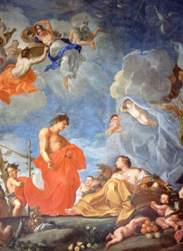 Poniżej i na prawo od tej grupy, na kolejnym obłoku unoszą się dwie kolejne boginie wyobrażone jako zwrócone do siebie kobiety, jedna w błękitnych, druga w żółtych szatach. Towarzyszy im lew, róg obfitości oraz pług.