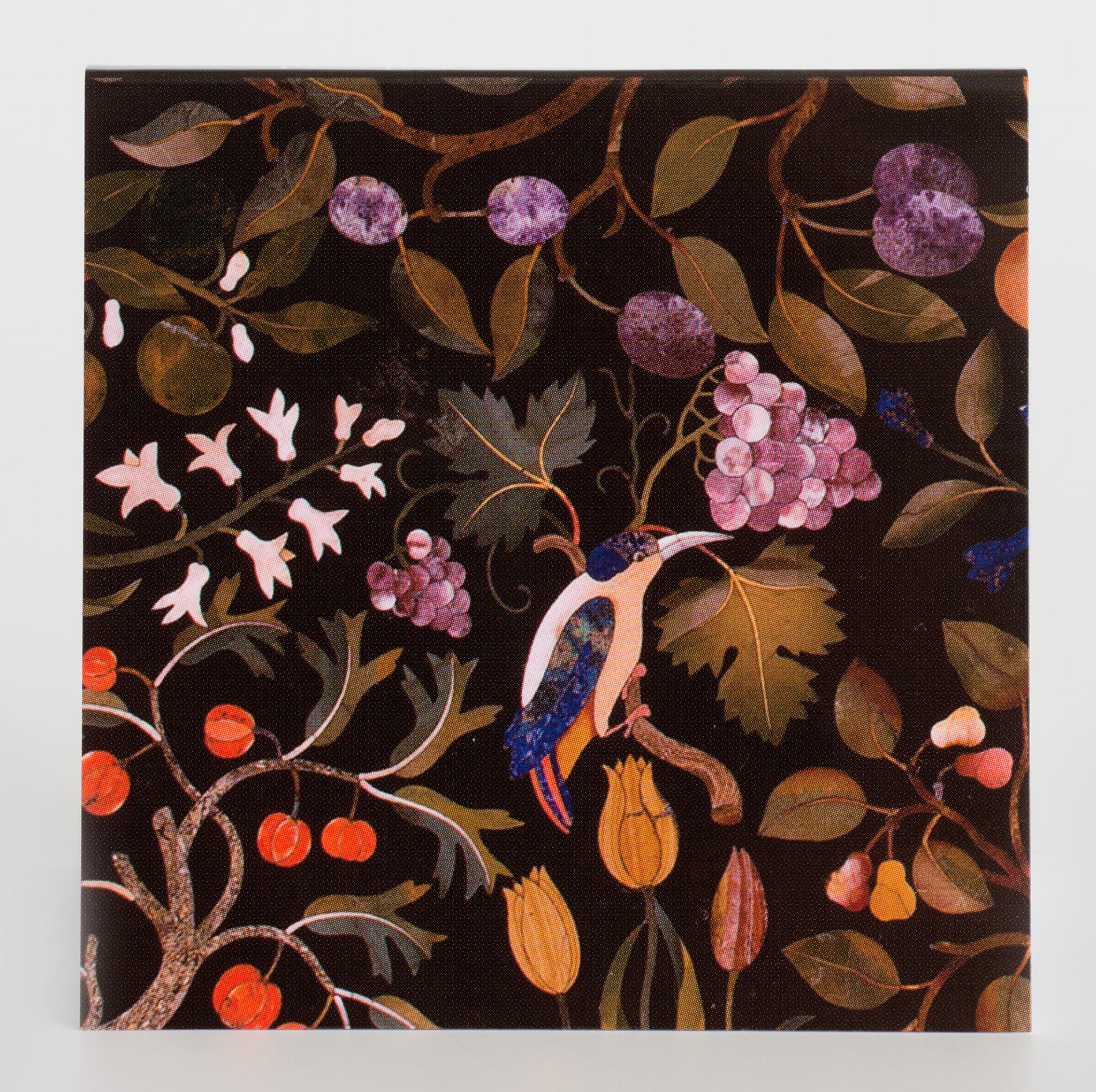 Karteczki samoprzylepne z widokiem fragmentu marmurowego blatu stołu znajdującego się na parterze pałacu wilanowskiego w cześci nazywanej Galerią Krajobrazów.