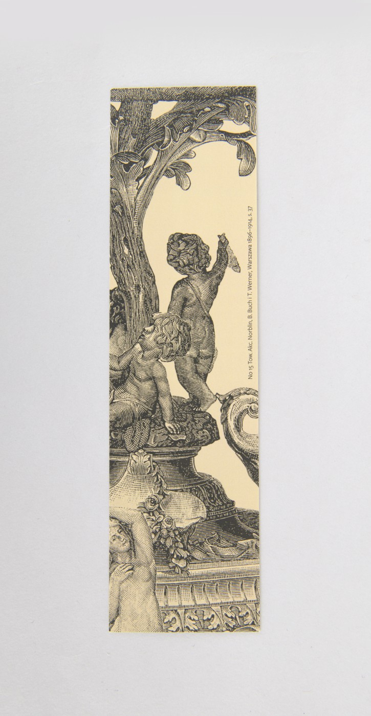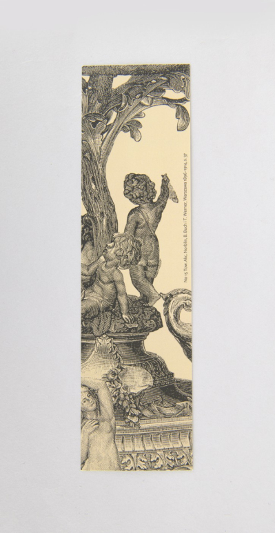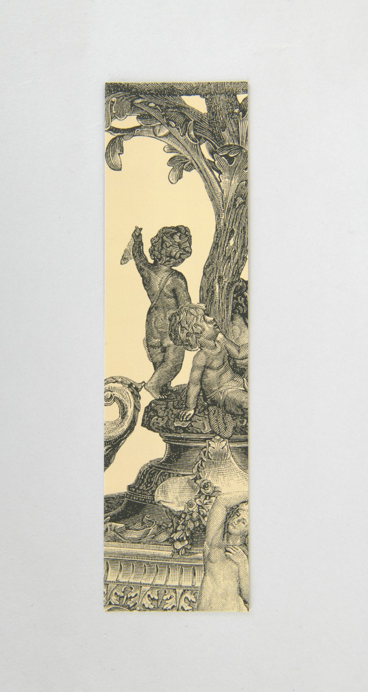 Zakładka z ilustracją przedstawiajacą fragment postumentu na owoce z amorkami.