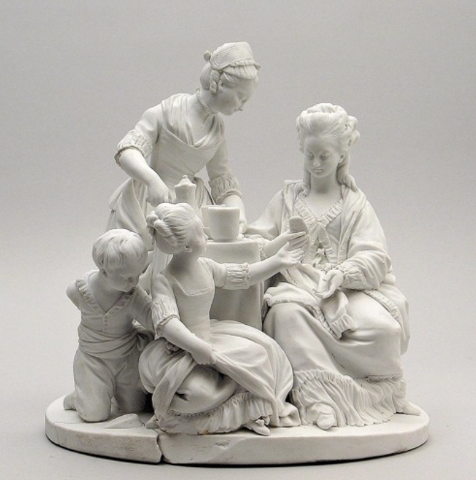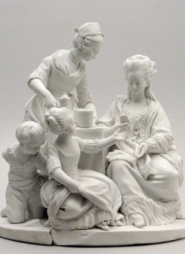Na niskim okrągłym postumencie cztery postaci zgromadzone są wokół małego stolika. Z lewej strony, stojąca za stołem służąca serwuje śniadanie. Obok niej na ziemi siedzi chłopiec i nieco starsza od niego dziewczynka, która wyciąga rękę do siedzącej na niskim zydelku matki opartej prawym łokciem o stolik. Blat nakryty jest sięgającym do ziemi obrusem. Stoją na nim dzbanek i wysokie kubki. Służąca to młoda dziewczyna ubrana w długą sukienkę z fartuszkiem, o dużym dekolcie, przykrytym po bokach chusteczką zwaną fichu . Na głowie dziewczyna ma czepek zdobiony koronką, a na szyi – bindę, czyli obróżkę, tutaj zakończoną krzyżykiem na tasiemce. Klęczący na ziemi chłopiec prawą rękę trzyma za plecami. Lewą sięga w dół, do czegoś, co znalazł na spódnicy siostry i to właśnie tam utkwiony jest jego wzrok. Chłopiec ubrany jest w spodnie i koszulkę z kołnierzem z haftem angielskim, zapiętą pod szyją na cztery guziki. W pasie przepasany szarfą. Lewą rękę chłopca zakrywa ramię siostry, która prawą ręką unosi lekko brzeg wierzchniej spódnicy. Dziewczynka na wpół siedzi, na wpół kuca na ziemi. Ma wysoko upięte włosy. Ubrana jest w długą sukienkę z rękawami do łokci wykończonymi marszczonymi mankietami. Dół spodniej warstwy sukni wykończony jest falbaną. Duży czworokątny dekolt zdobi koronka. Na stopach pantofelki z kokardkami. Dziewczynka podnosi twarz w kierunku matki i wyciąga rękę po trzymaną przez nią kromkę chleba. Kobieta o wysoko upiętych włosach, ubrana jest w luźną suknię domową , tzw. dezabilkę, wykończoną u dołu falbaną. Krawędzie ubioru obszyte są riuszkami – marszczonymi pasami materiału. Po ramionach matki spływa zarzucony na szyję szal.