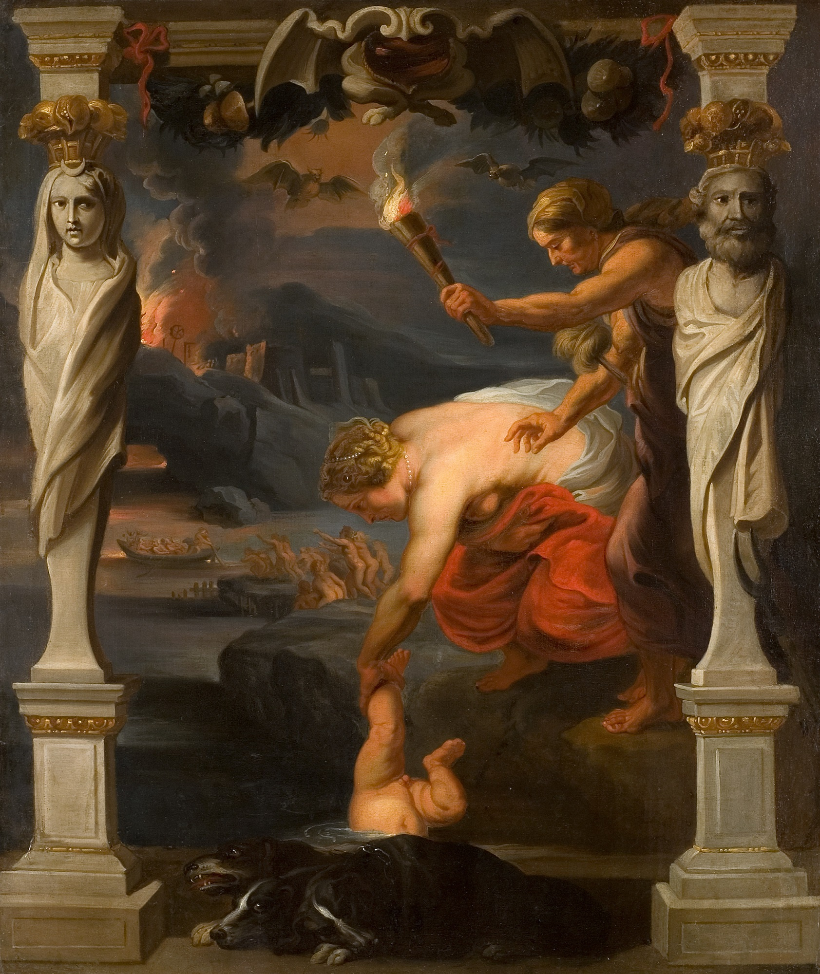 Tematem kompozycji jest moment, gdy potajemnie, nocą Tetyda, chcąc obdarzyć syna nieśmiertelnością, zanurza go w Styksie. Trzyma go tylko za stopę. Obok niej stoi starsza kobieta, która jedną ręką ujmuje pochodnię, a drugą wskazuje na dziecko. Ma przytroczoną kądziel. Jest to zapewne Kloto – jedna Parek, bogiń przeznaczenia. Jej gest zdaje się zapowiadać daremność starań Tetydy, ponieważ Achilles nie uniknie swego losu i zginie pod Troją, ugodzony strzałą w piętę. Tylko pięty jego matka nie zdążyła zanurzyć w Styksie. Dalej wody Styksu, na którego brzegu widzimy postacie zmarłych, wyciągających błagalnie ręce w stronę odpływającej łodzi Charona wypełnionej duszami. Na niebie unoszą się złowieszcze dwa nietoperze. W głębi na skale, obok buchających płomieni, mury piekielnej twierdzy, obok których dwie szubienice i pal z kołem. Całość ujęta w architektoniczno-rzeźbiarską ramę. Tworzą ją hermy podtrzymujące belkowanie, będące wyobrażeniami władców Piekła, Persefony i Plutona. Między nimi, na pierwszym planie spoczywa śpiący dwugłowy pies – Cerber, strażnik królestwa podziemi.